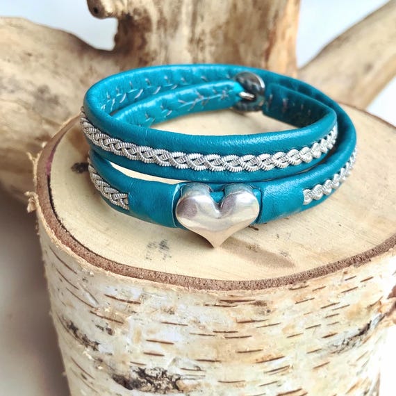 Traditional Sami double wrap around reindeer leather bracelet, with a braid of flat pewter threads. Unisex handmade to order.