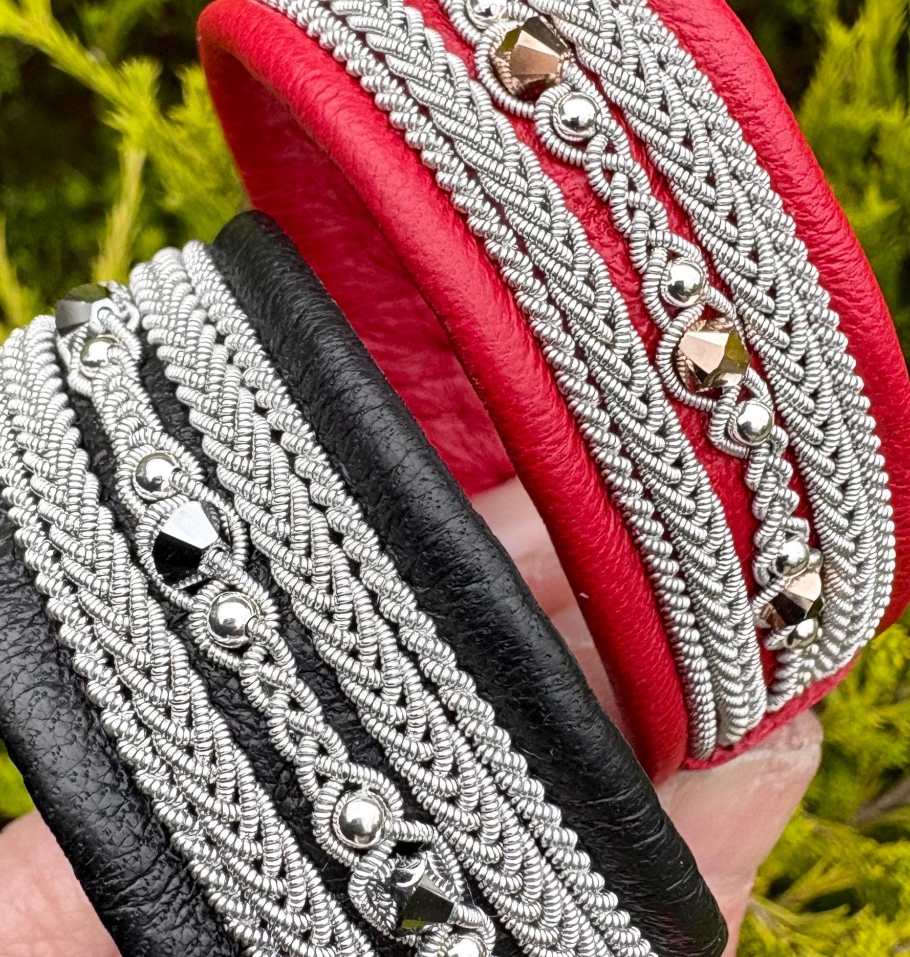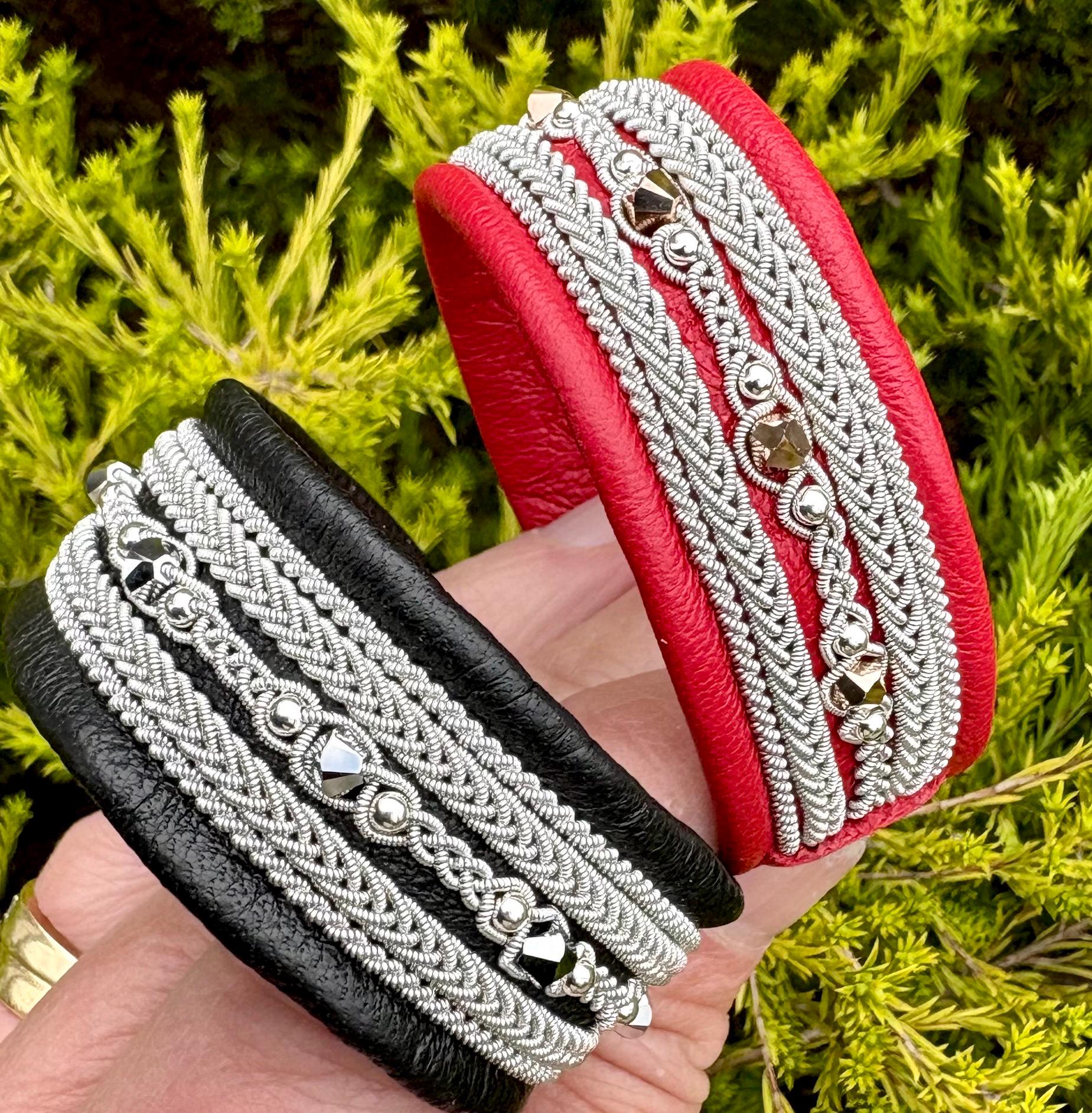 Wide Nordic reindeer leather bracelets, with traditional pewter braiding, crystals and sterling silver beads.