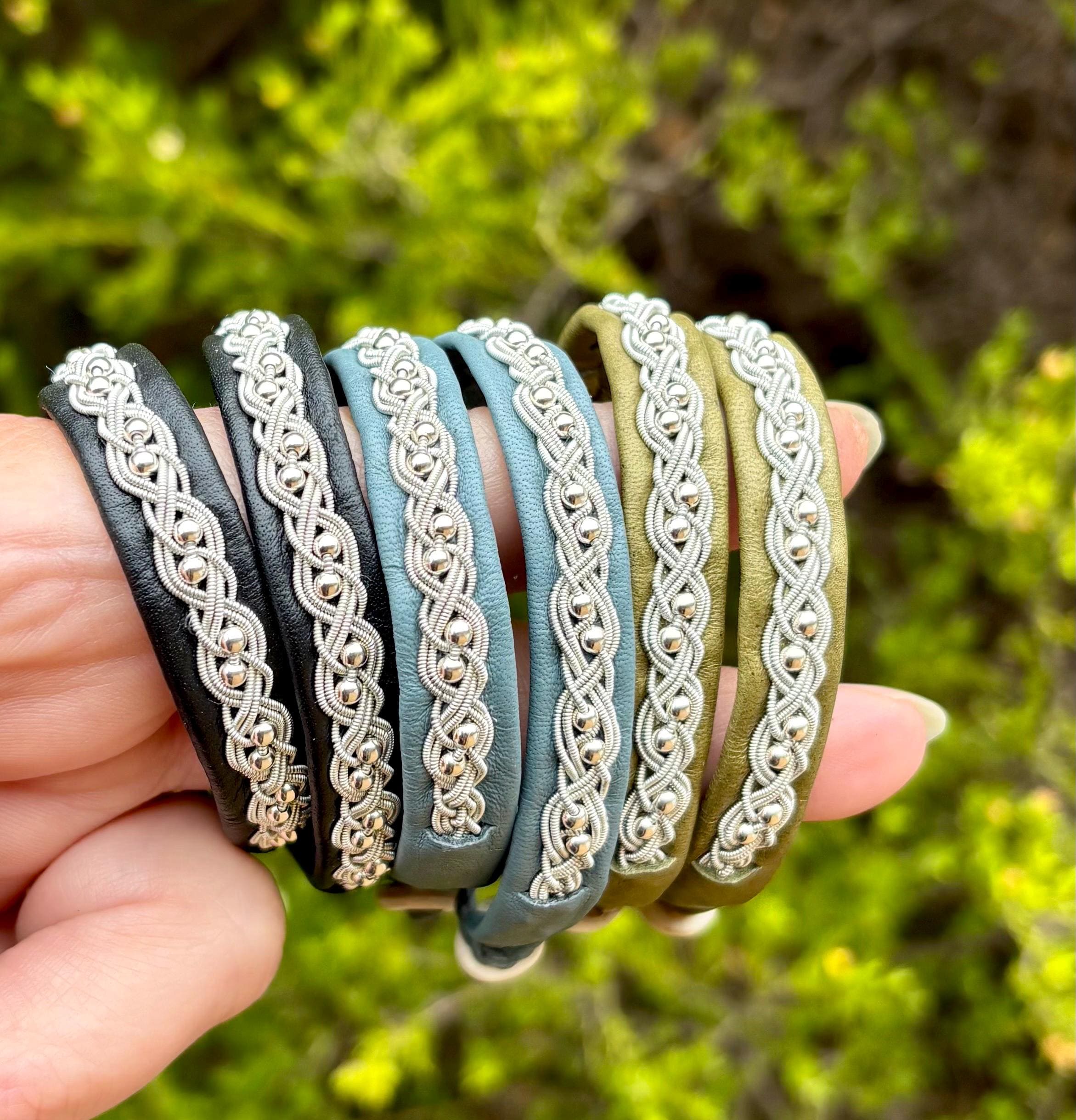 Handmade Leather Bracelets, Custom made to order, Unisex leather accessories, Nordic Sami jewellery, Pewter silver braided bracelets, Reindeer leather jewelry, sizes from extra small to extra large.