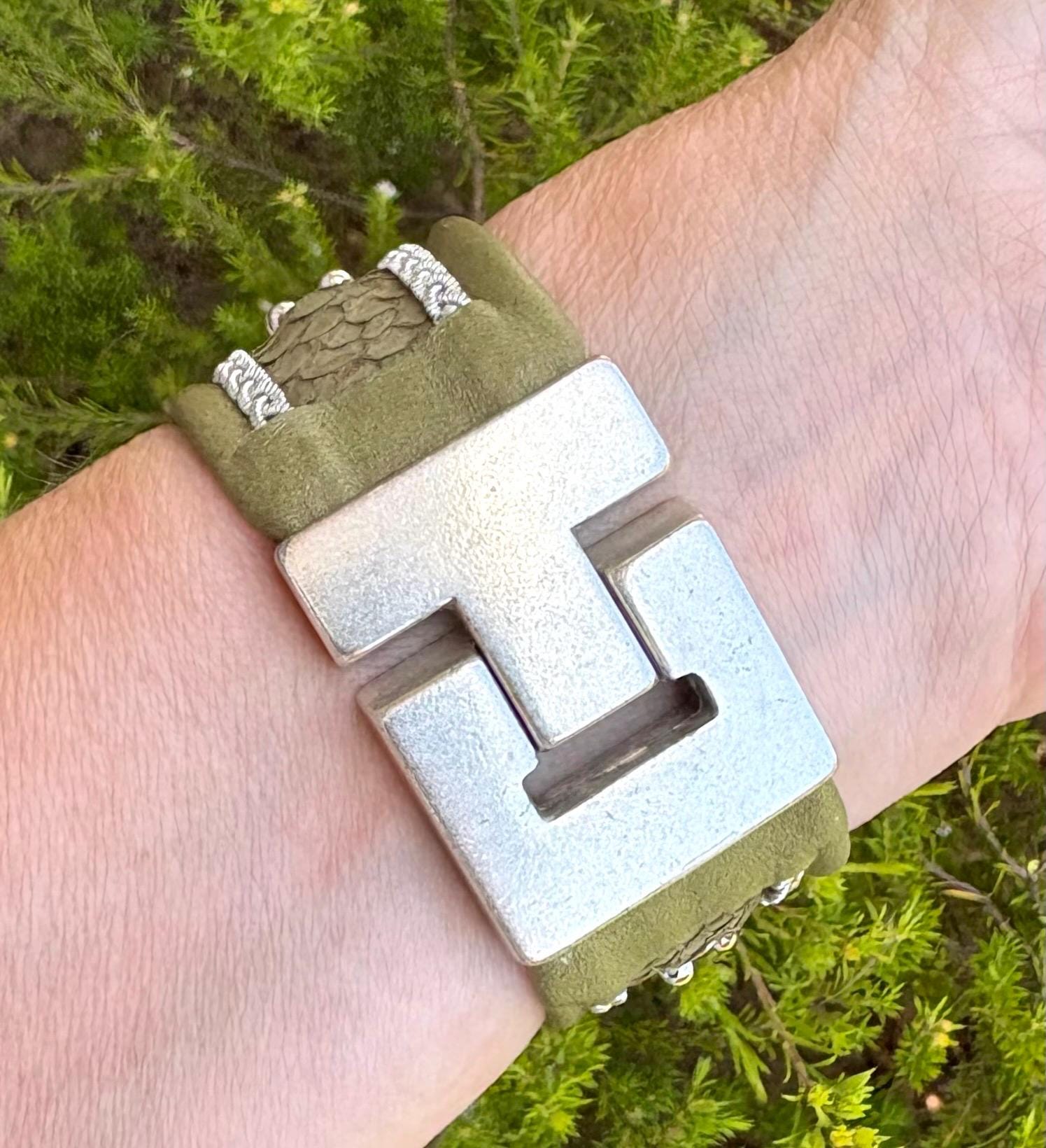 Traditional Sami inspired cuffs, with the softest reindeer and beautiful textured salmon leather. Handmade with three braids of pewter and silver threads (middle with sterling silver beads).