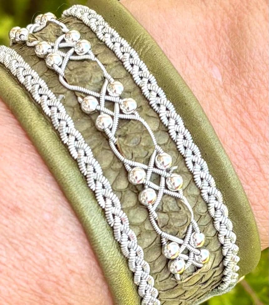 The border braids are made with flat pewter and silver threads. Middle row with sterling silver beads. These braids are hand sewn on. The clasp is a magnetic clasp as a standard, but can be made with shed antler button or pewter button.