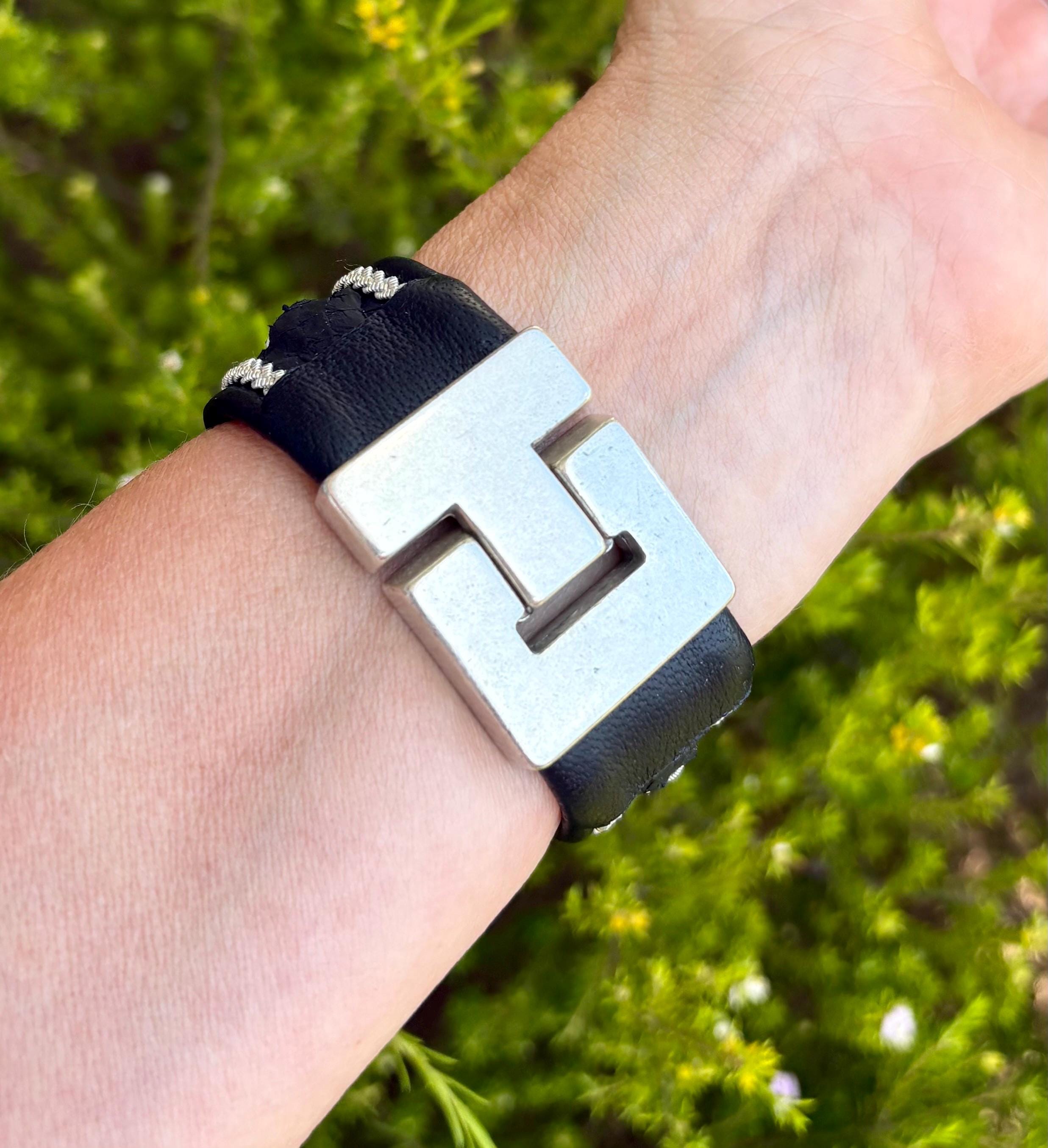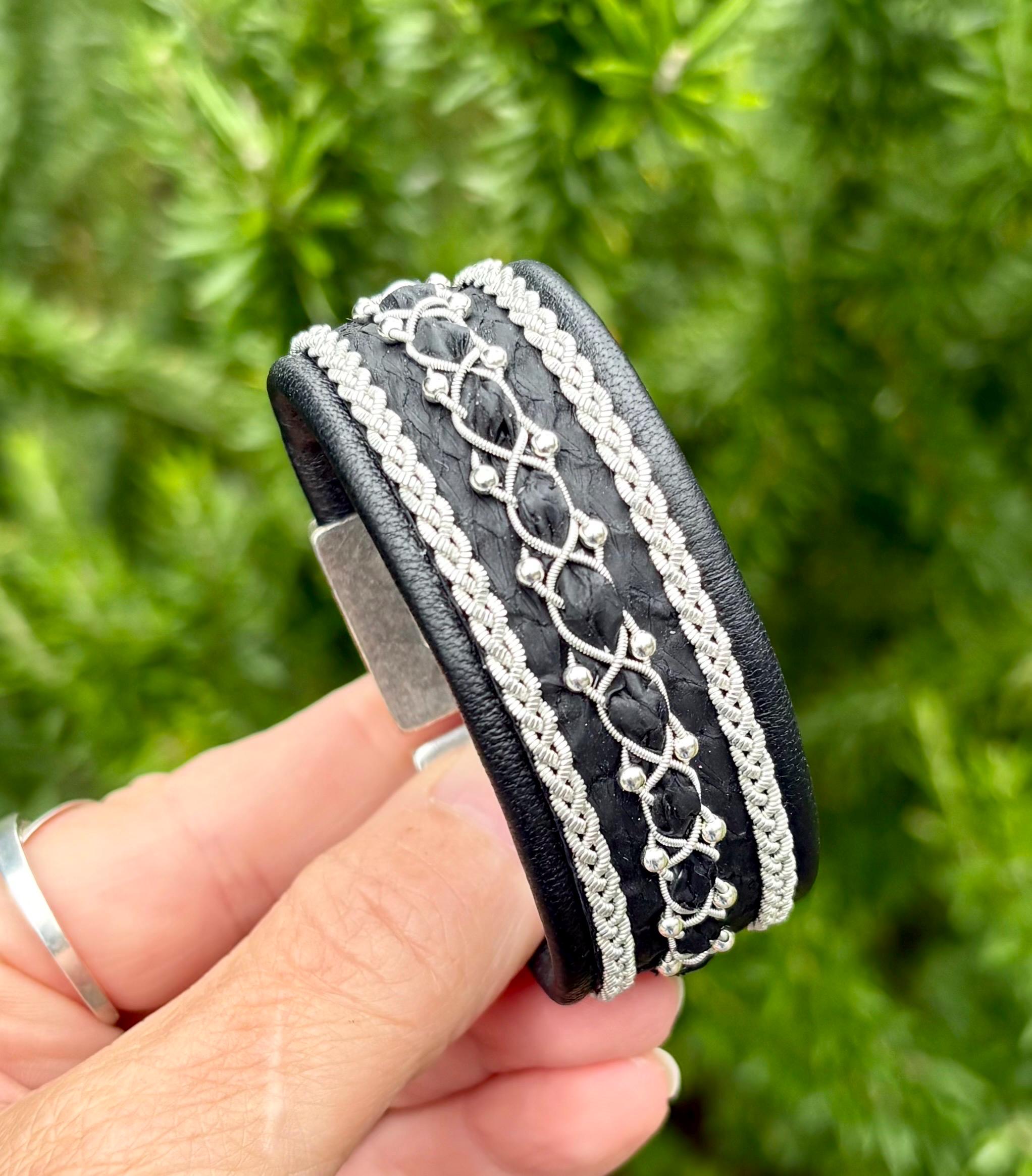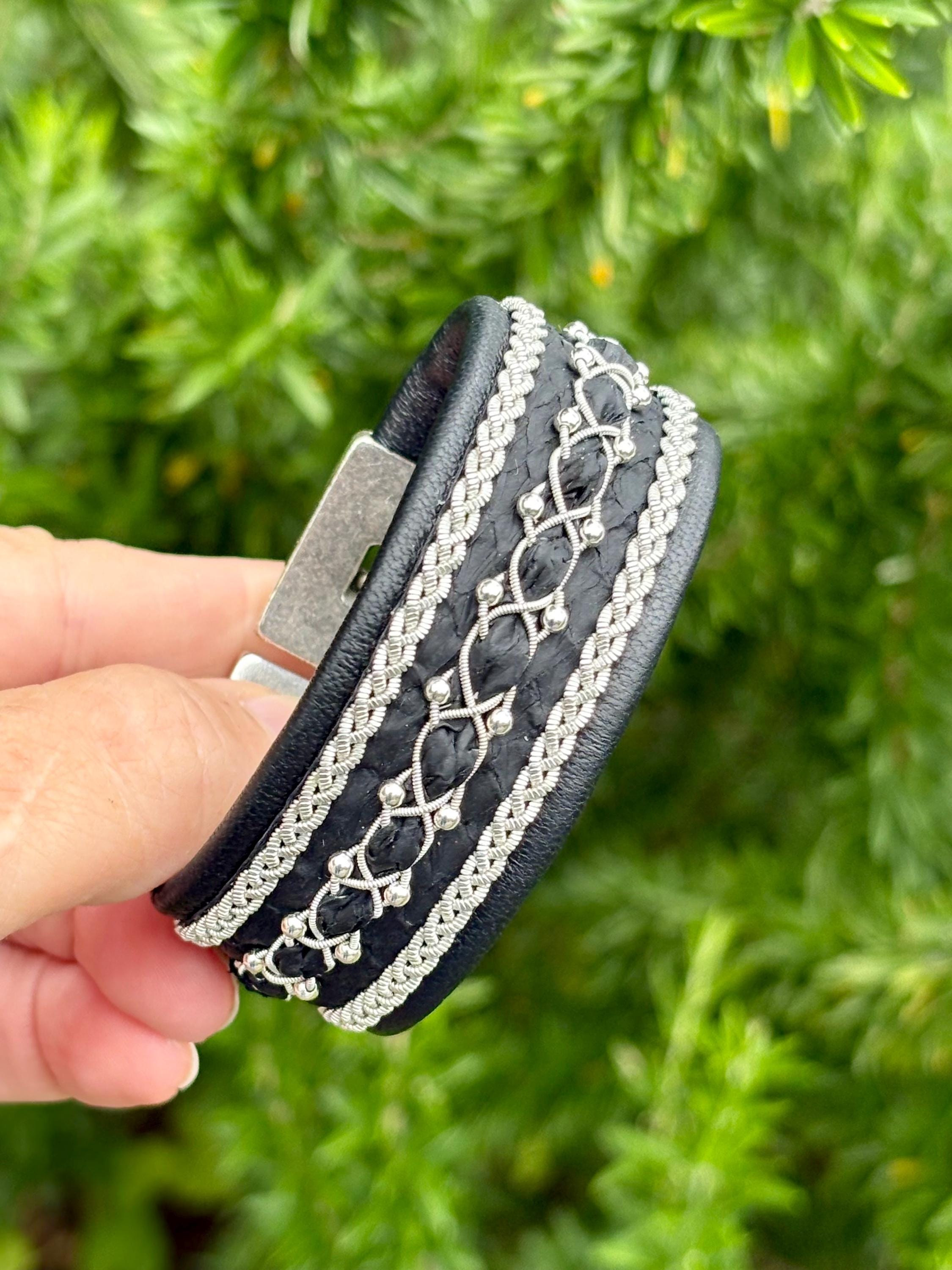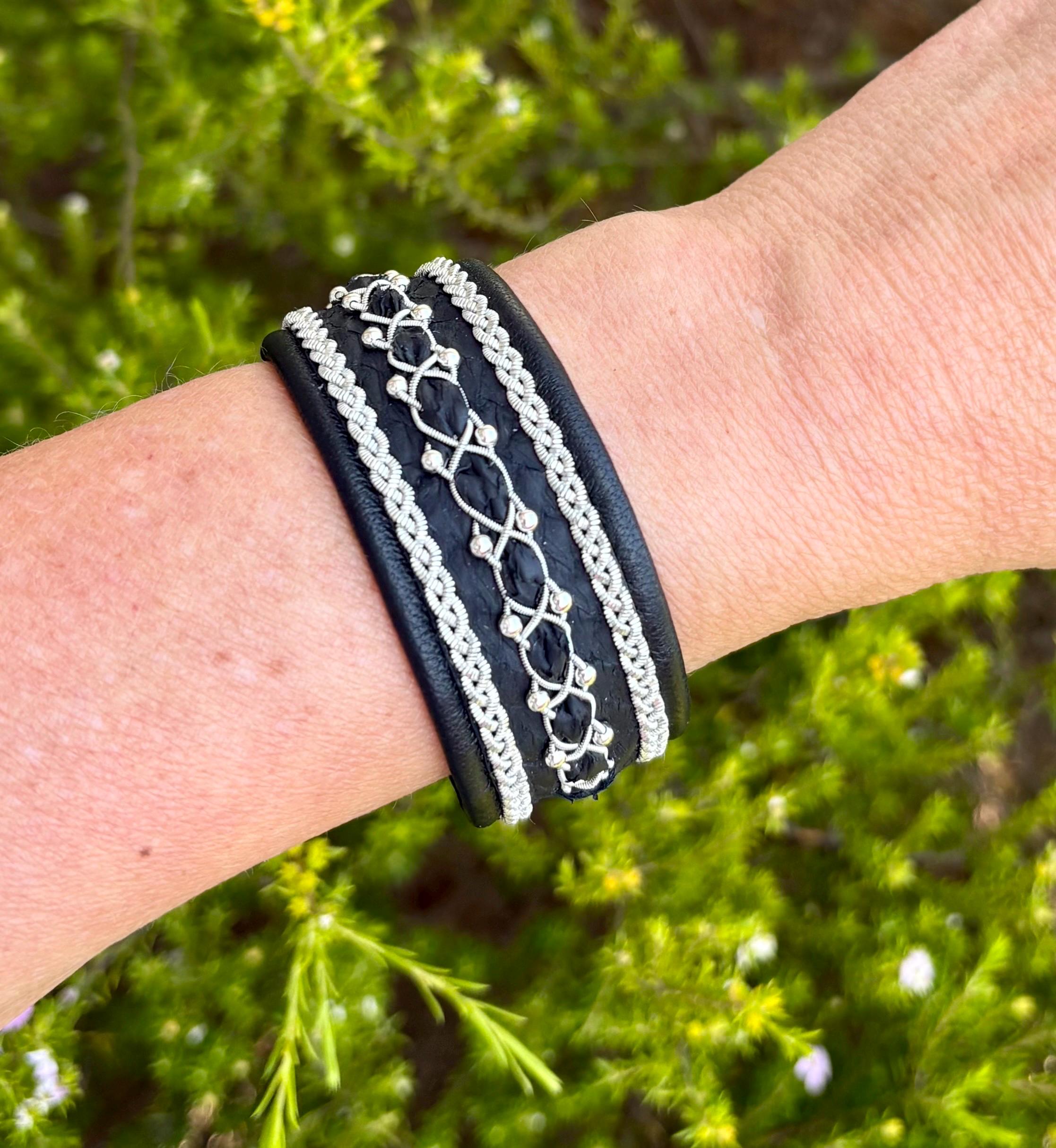 Traditional Sami inspired cuffs, with the softest reindeer and beautiful textured salmon leather combination. Handmade with three braids of pewter and silver threads (middle with sterling silver beads and salmon strip).