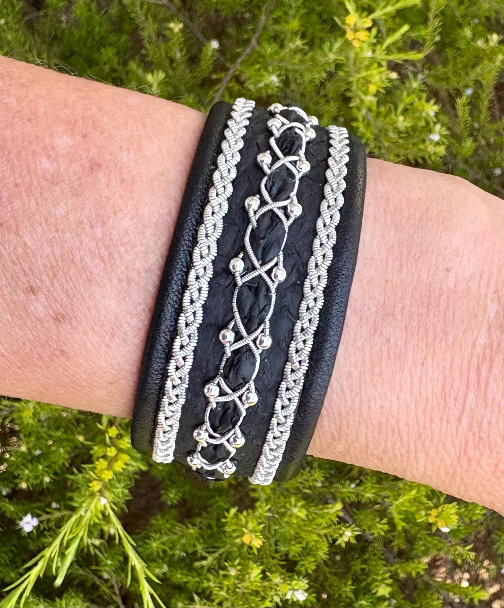 The border braids are made with flat pewter and silver threads. Middle row with sterling silver beads. These braids are hand sewn on. The clasp is a magnetic clasp as a standard, but can be made with shed antler button or pewter button.