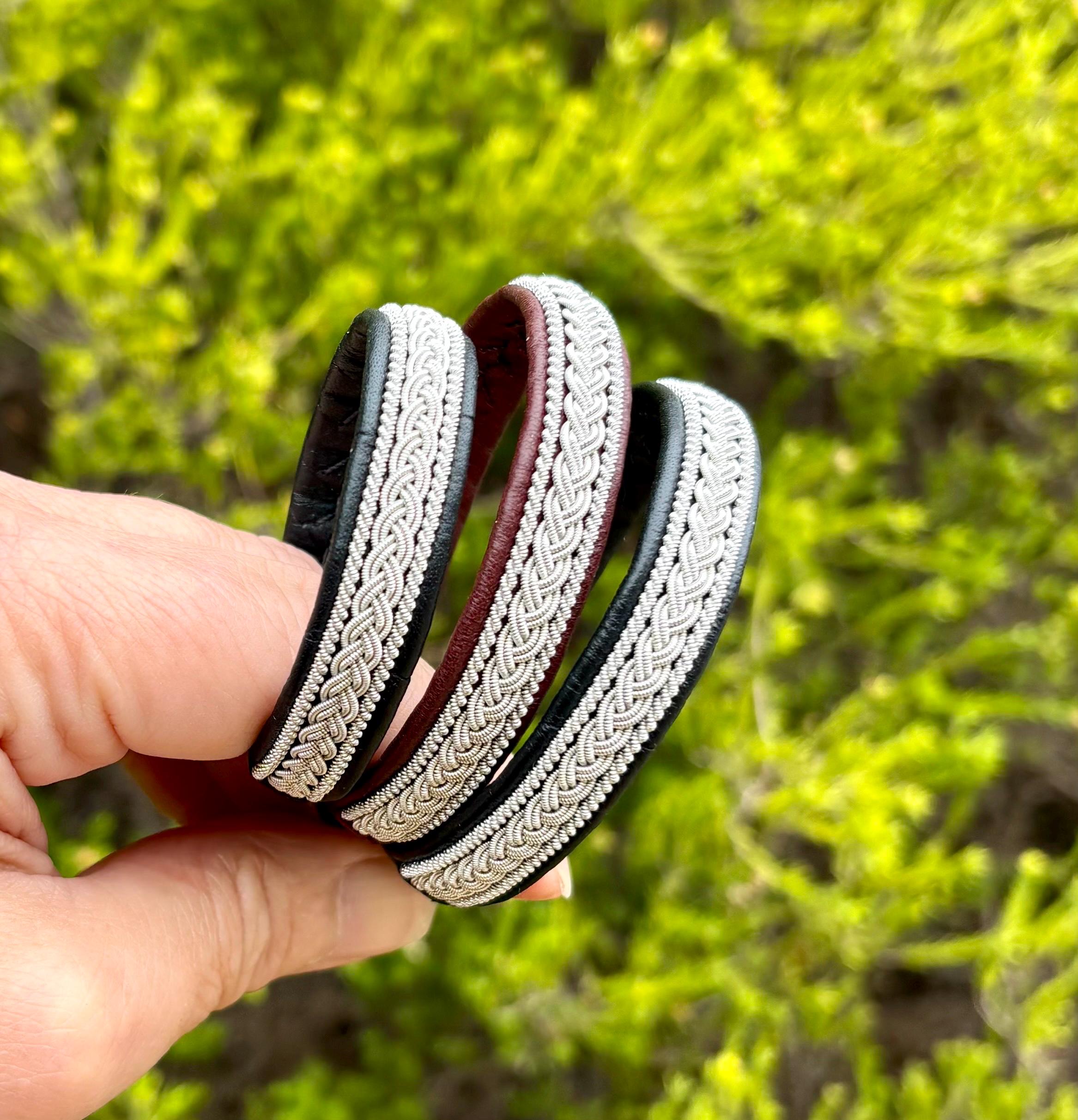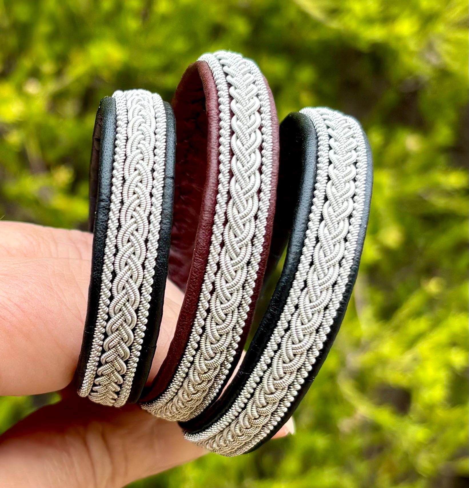 Traditional Nordic Sami inspired reindeer leather bracelet with pewter and silver threads braid and borders.