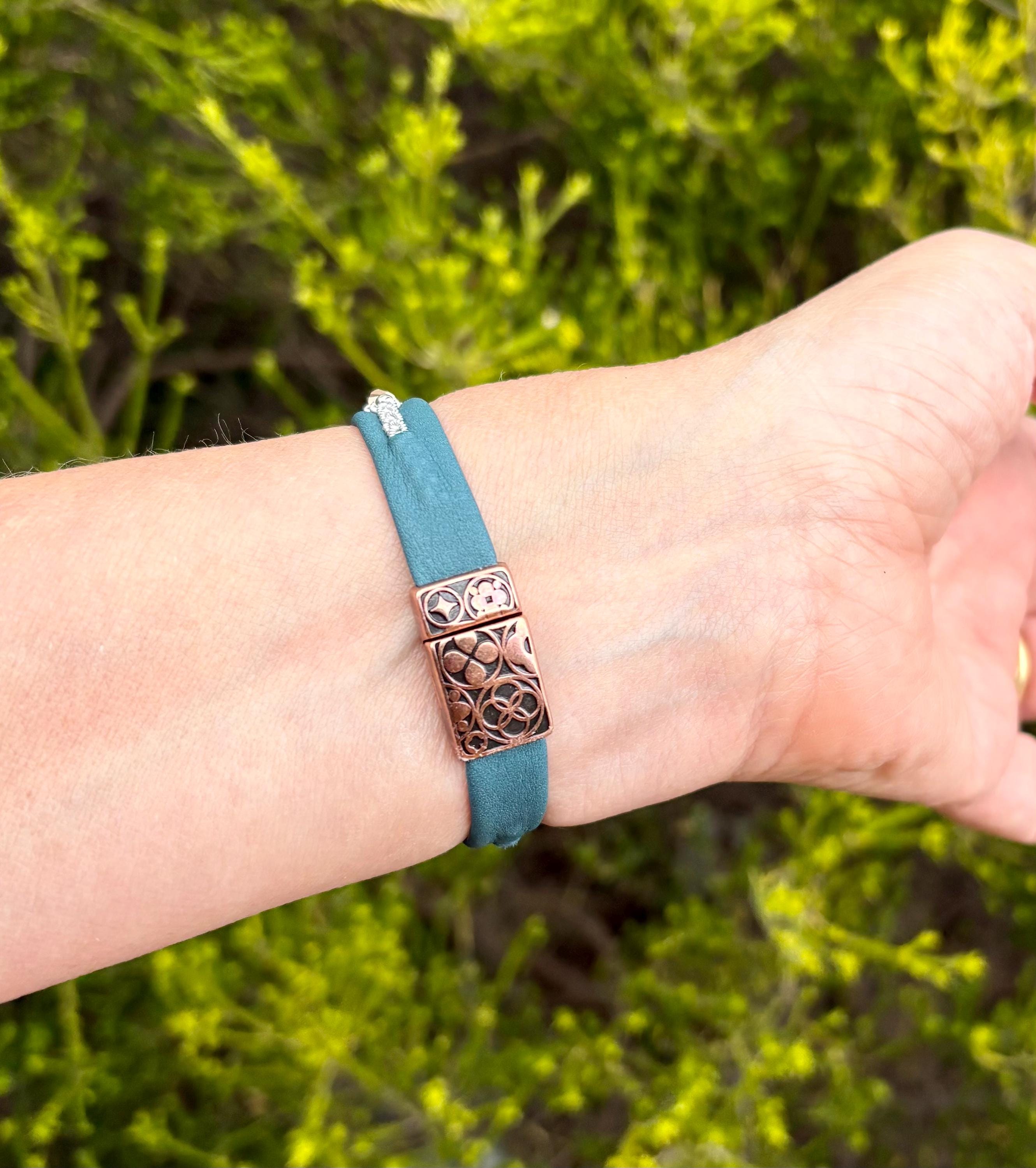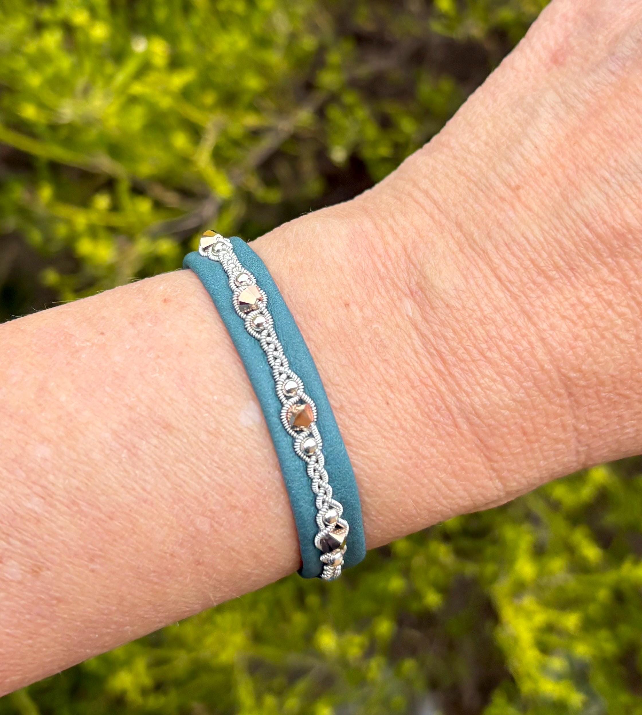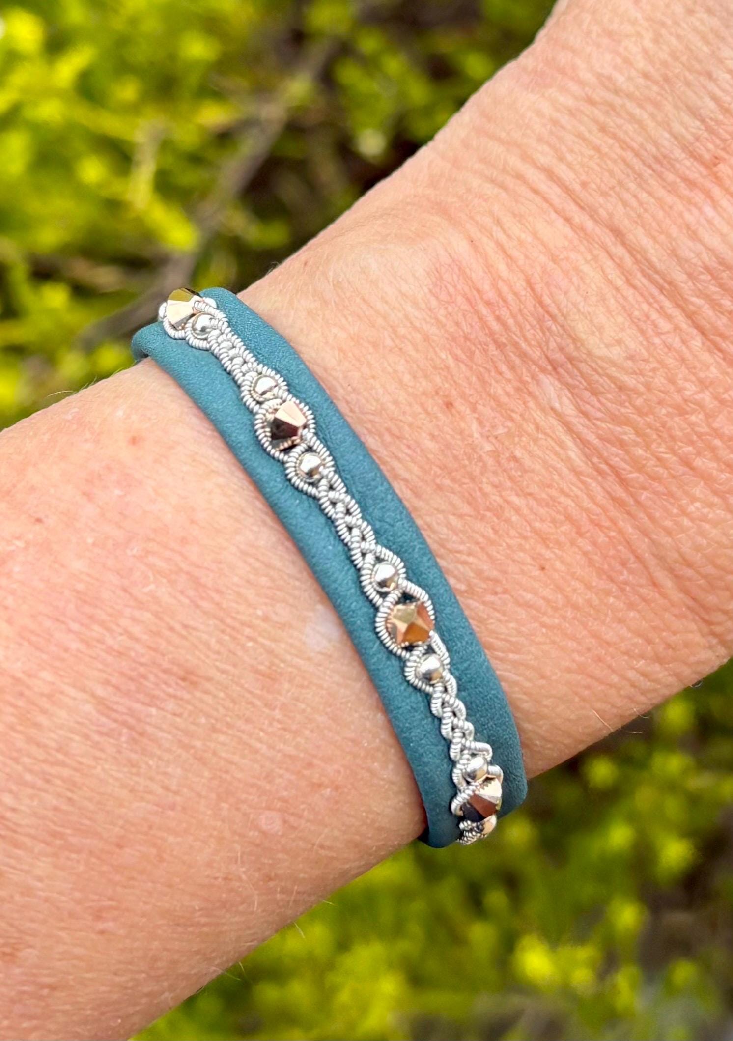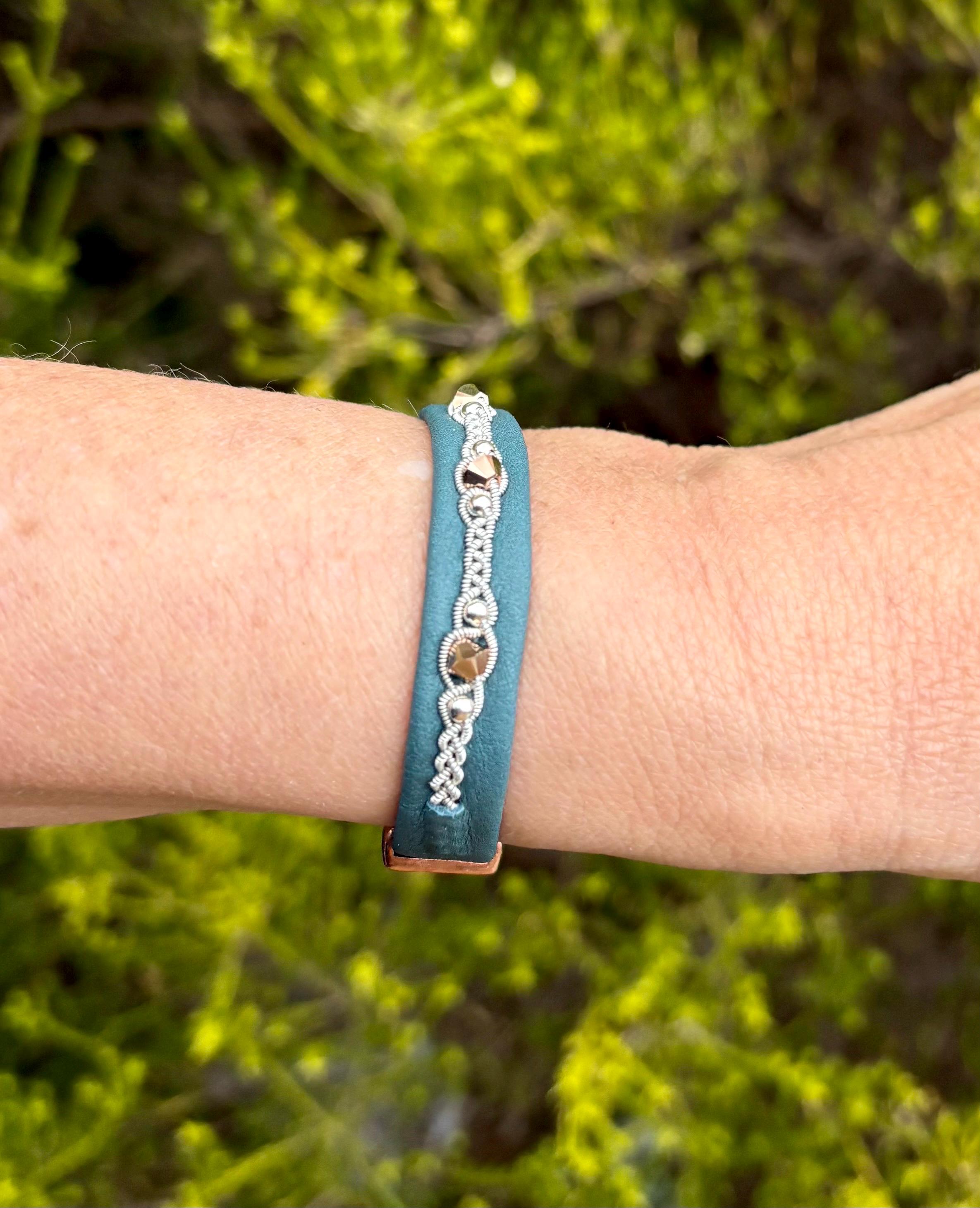 After extended wear, the pewter threads will flatten down and become shiny. The leather will soften, mold to your wrist and maintain its shape for years to come.