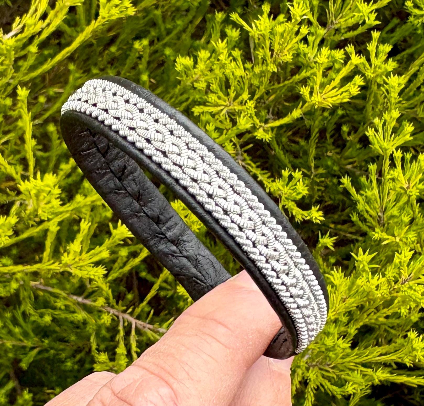 After extended wear, the pewter threads will flatten down and become shiny. The leather will soften, mold to your wrist and maintain its shape for years to come.